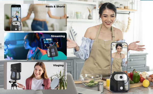 Think of it as a 360° Rotation Mobile Stand for Video Recording that actually thinks. The AI locks onto your face and follows your every move. Walk, turn, or demo a step. The frame stays perfect. Your content looks pro without a second pair of hands.